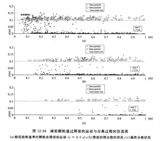 DEM仿真的過程信息能夠在線不同篩分工作條件下顆粒再篩面的運動、顆粒同篩面之間的碰撞過程、顆粒通過篩網(wǎng)的分離過程,反映了不同力度顆粒在篩面上運動形態(tài)的差異,再現(xiàn)不同振動篩分機(jī)工作條件下顆粒運動過程,較為真實的描述顆粒同篩面之間的碰撞過程。圖12-38為Li等人模擬2mm和8mm球形顆粒通過篩面的運動與分離過程圖。